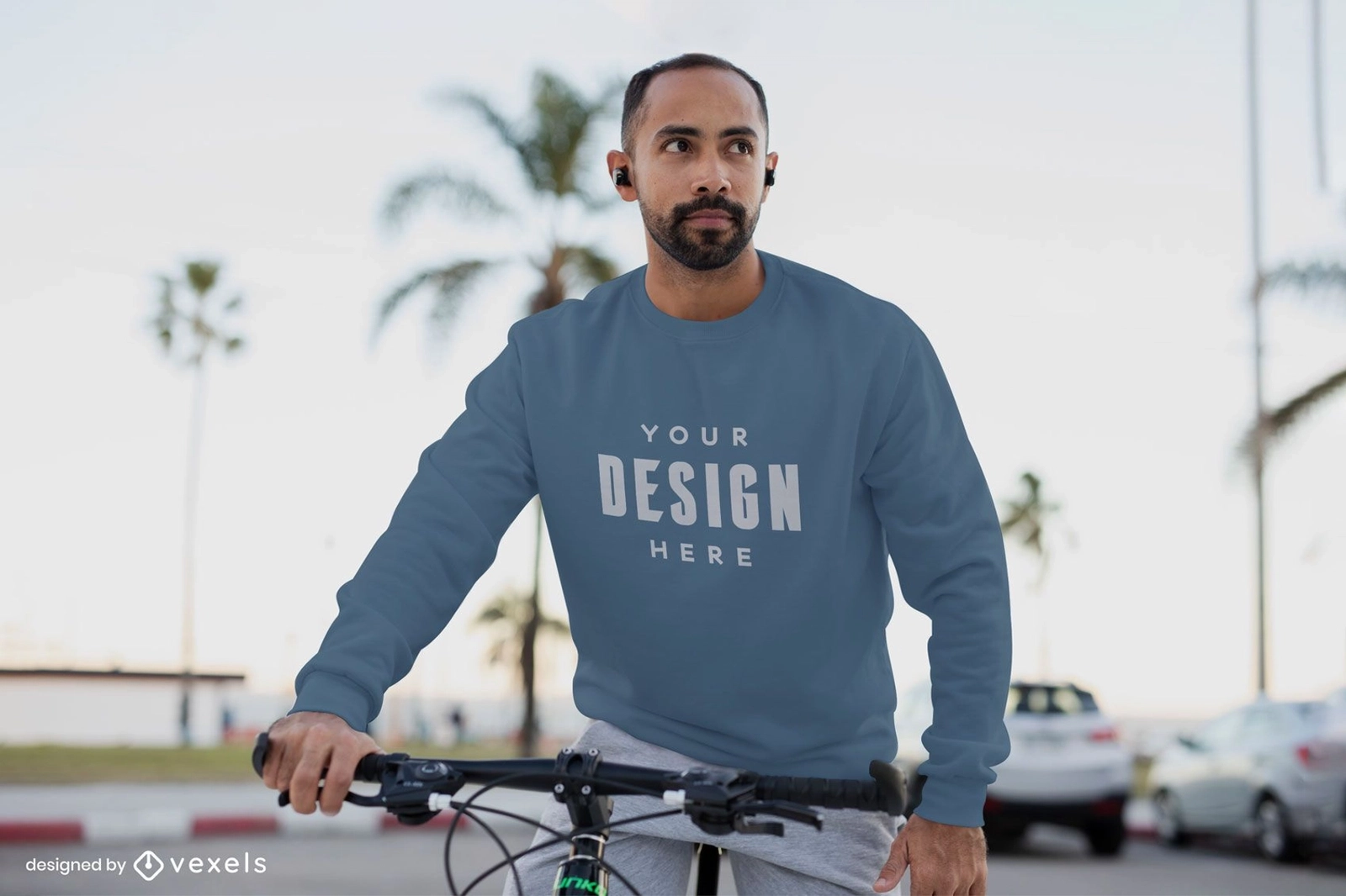 Maquete incrível que mostra um homem andando de bicicleta enquanto usava um moletom editável. Coloque logotipos e imagens em nossos Mockups PSD e edite-os com nossos objetos inteligentes fáceis de usar para Photoshop.