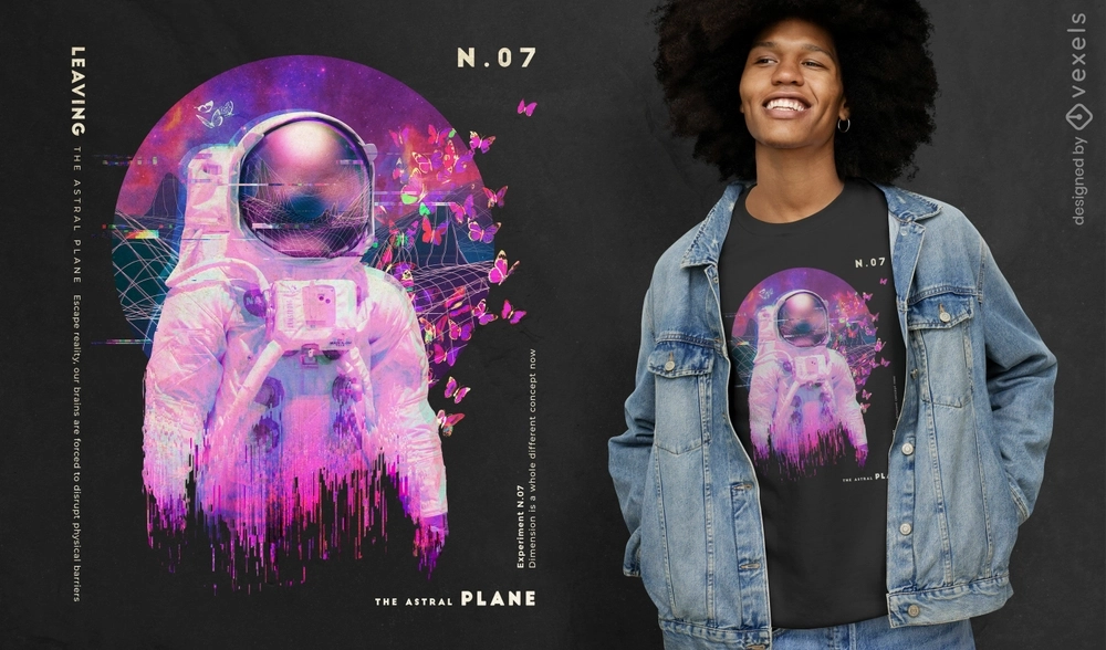 Design lindo de uma camiseta psd de um astronauta com falha no estilo vaporwave. Use este design de t-shirt editável PSD perfeito para plataformas Print on Demand como Merch by Amazon, Printful e muito mais. O modelo vem com PNG pronto para merch!