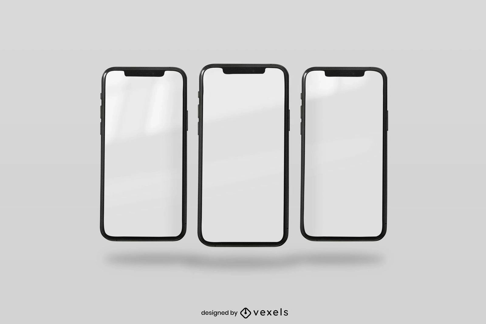 Maquete incrível com três telefones com telas editáveis. Edite e use este Mockup PSD no Photoshop usando nossas camadas editáveis, adereços móveis e escaláveis. Contém objetos inteligentes para facilitar o posicionamento do design.