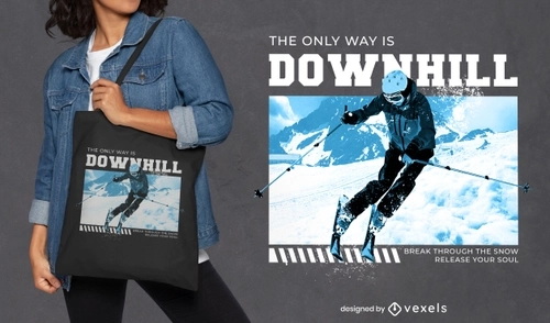 Design de sacola incrível que apresenta alguém esquiando e a citação "A única maneira é apenas em declive". Use este incrível design de sacola pronta para impressão para plataformas POD como Merch by Amazon, Redbubble, Printful e muito mais.