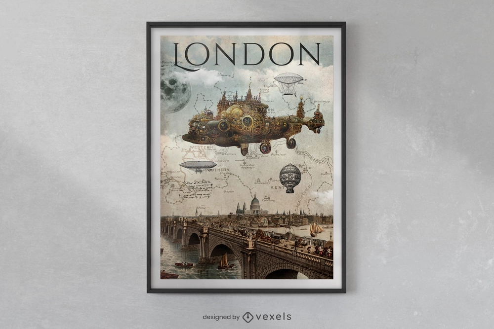 Confira este incrível design de pôster em PSD de uma versão steampunk de Londres! Baixe este design de pôster pronto para imprimir e adicione outro produto à sua Merch Store.