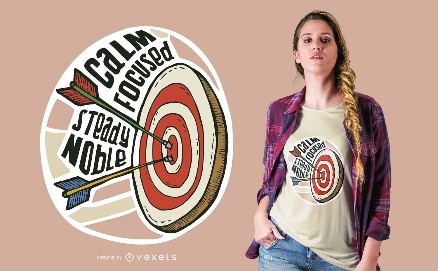 Tiro com Arco T-shirt Target Design com duas flechas e um alvo e as palavras CALM FOCUSED STEADY NOBLE para o nicho do tiro com arco. Pode ser usado em camisetas moletons canecas pôsteres e qualquer outra mercadoria. Pronto para usar no Merch da Amazon e outras plataformas de impressão sob demanda como Redbubble Teespring Spreadshirt e outras.