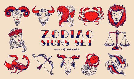 Conjunto de signos do zodíaco vintage apresentando um conjunto de ilustrações de estilo de tatuagem inspirado retro legal para todos os 12 signos do zodíaco apresentando Áries Touro Gêmeos Câncer Leão Virgem Libra Escorpião Sagitário Capricórnio Aquário e Peixes. Ótimo para fãs de projetos temáticos astrológicos!