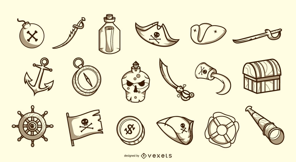 Coleção de estilo duotônico com vários elementos relacionados a piratas como uma moeda de ouro um volante de navio e muito mais! Cada um pode ser usado individualmente.