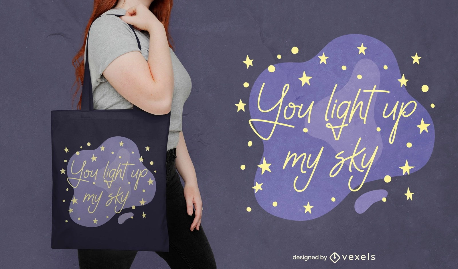 Lindo design de sacola com a citação "Você ilumina meu céu" com estrelas e brilhos. Use este incrível design de sacola pronta para impressão para plataformas POD como Merch da Amazon, Redbubble, Printful e muito mais.