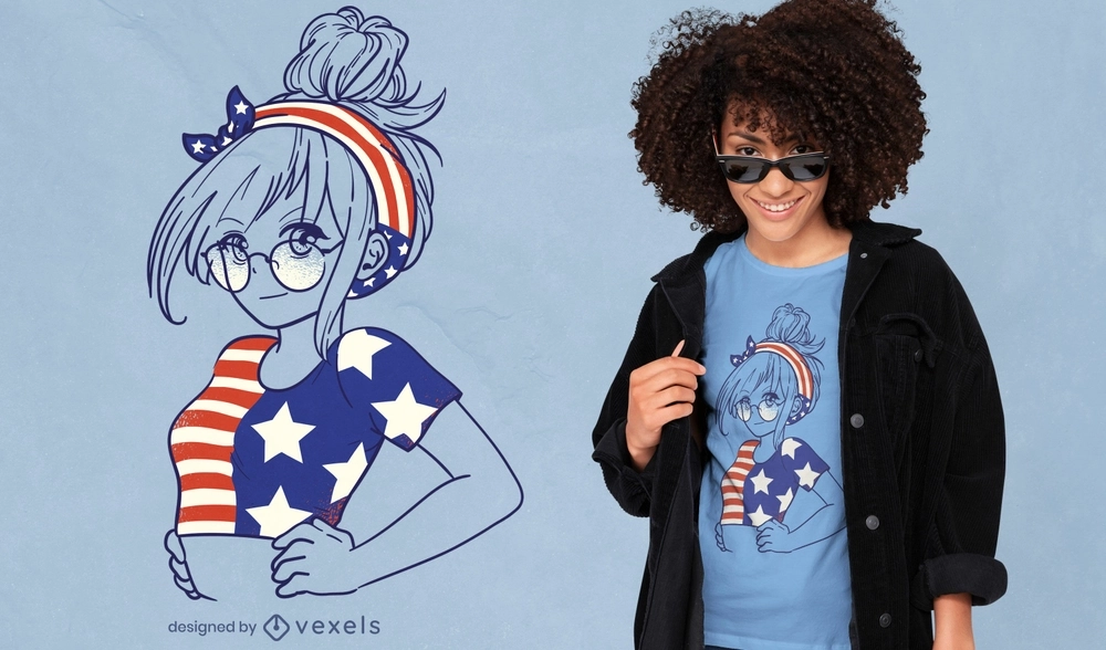 Projeto bonito do t-shirt que caracteriza uma menina que veste uma camisa e uma bandana com a bandeira americana. Pode ser usado em camisetas, moletons, canecas, pôsteres e qualquer outra mercadoria. Pronto para uso no Merch by Amazon e outras plataformas de impressão sob demanda, como Redbubble, Teespring, Printful e outras.