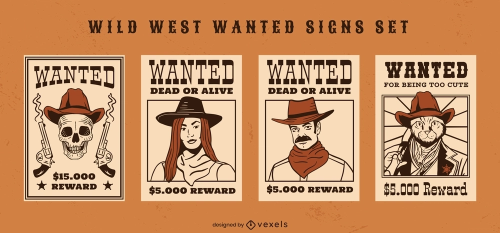 Desenhos de ilustração do oeste selvagem com diferentes sinais de procurado, com um homem, uma mulher, uma caveira e um gato vestidos de cowboys. Cada sinal pode ser usado separadamente.