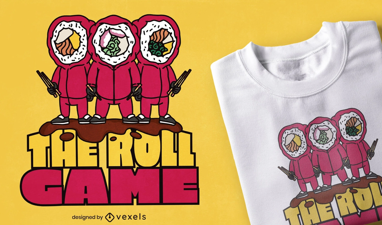 Design engraçado do t-shirt que caracteriza três rolos de sushi vestidos com casacos vermelhos e as citações "o jogo do rolo". seu design gráfico de camiseta pode ser usado em camisetas, canecas, pôsteres, moletons e outros produtos merch. Vem com um arquivo PNG transparente, perfeito para plataformas POD como Merch da Amazon, Redbubble, Teespring, Printful e muito mais.