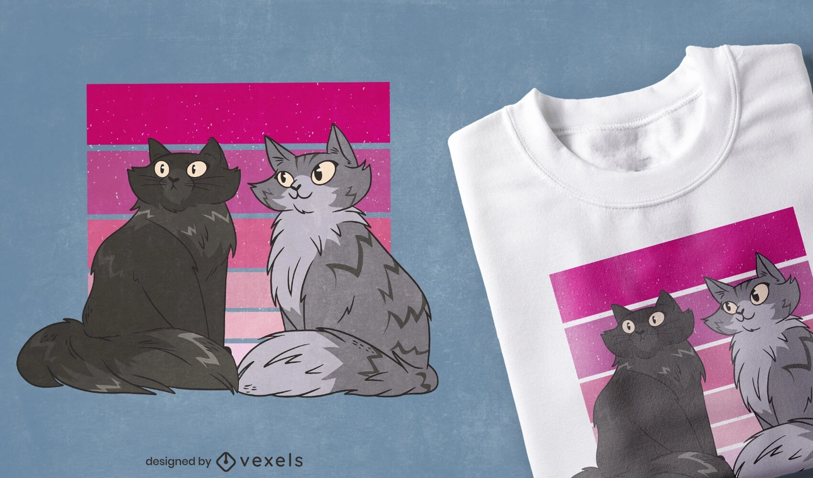 Design de t-shirt legal que apresenta dois gatos e um fundo gradiente. Use este design pronto para impressão para camisetas, pôsteres, canecas, moletons e outros produtos de merchandising. Elegível para ser usado em plataformas POD como Merch by Amazon, Teespring, Redbubble, Printful e muito mais.