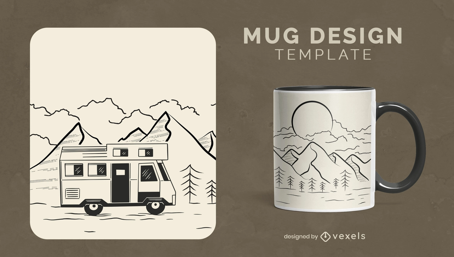 Design impressionante da caneca que caracteriza uma camionete de acampamento nas montanhas. Baixe este design de caneca pronto para impressão e venda-o em Merch PODs. O gráfico do copo vem em AI, JPG e PNG transparente.