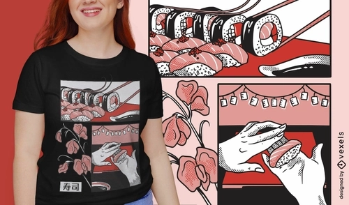 Design de camiseta legal com uma vinheta de estilo japonês que contém um par de mãos preparando sushi ao lado de muitos rolos de sushi. Pode ser usado em camisetas, moletons, canecas, cartazes e qualquer outra mercadoria. Pronto para uso em Merch by Amazon e outras plataformas de impressão sob demanda, como Redbubble, Teespring, Printful e outras.