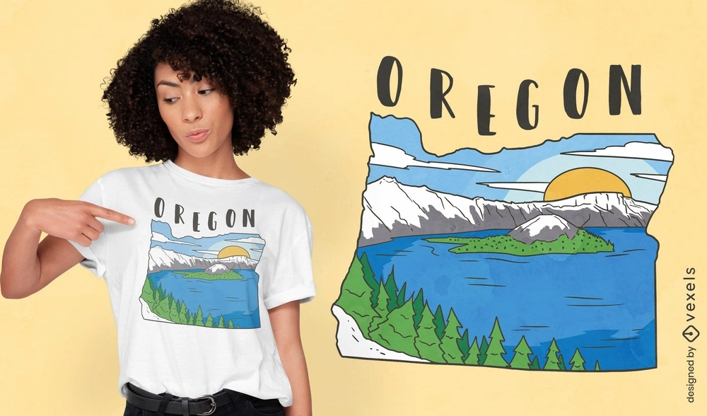 Grande design de t-shirt que caracteriza o mapa de Oregon com montanhas, um lago e árvores. Este design gráfico do T pode ser usado em camisas, canecas, cartazes, moletons e outros produtos merch. Vem com um arquivo PNG transparente, perfeito para plataformas POD como Merch by Amazon, Redbubble, Teespring, Printful e muito mais.