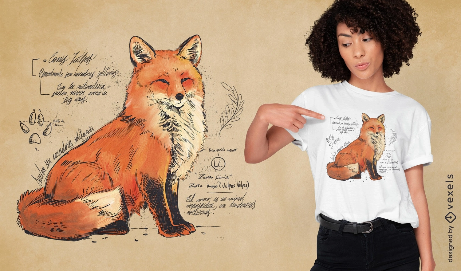 Design legal de camiseta com um esboço detalhado de uma raposa com anotações manuscritas, como em um jornal científico. Pode ser usado em camisetas, moletons e qualquer outra mercadoria. Pronto para usar no Merch by Amazon e outras plataformas de impressão sob demanda, como Redbubble, Teespring, Printful e outras.